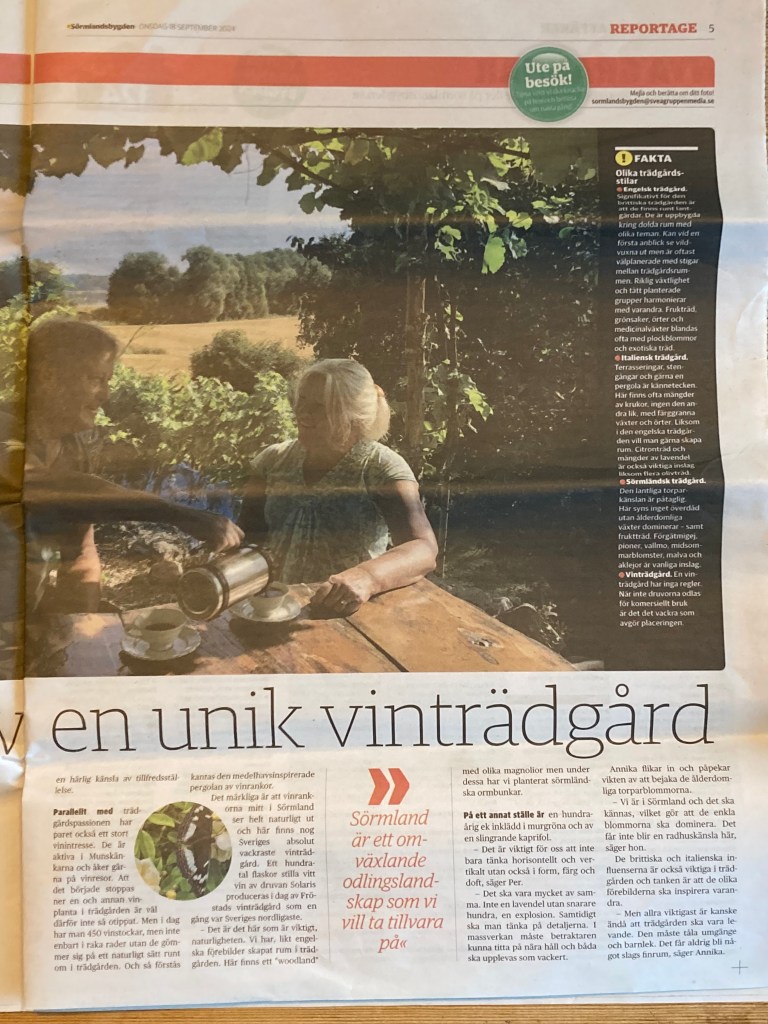 Läs om oss i ”Sörmlandsbygden”. (sormlandsbygden.se/2024/09/21/deras-passion-blev-en-unik-vintradgard) Om den kommer upp som låst skriv pergiertz@yahoo.se (användarnamn) Solaris (lösenord)